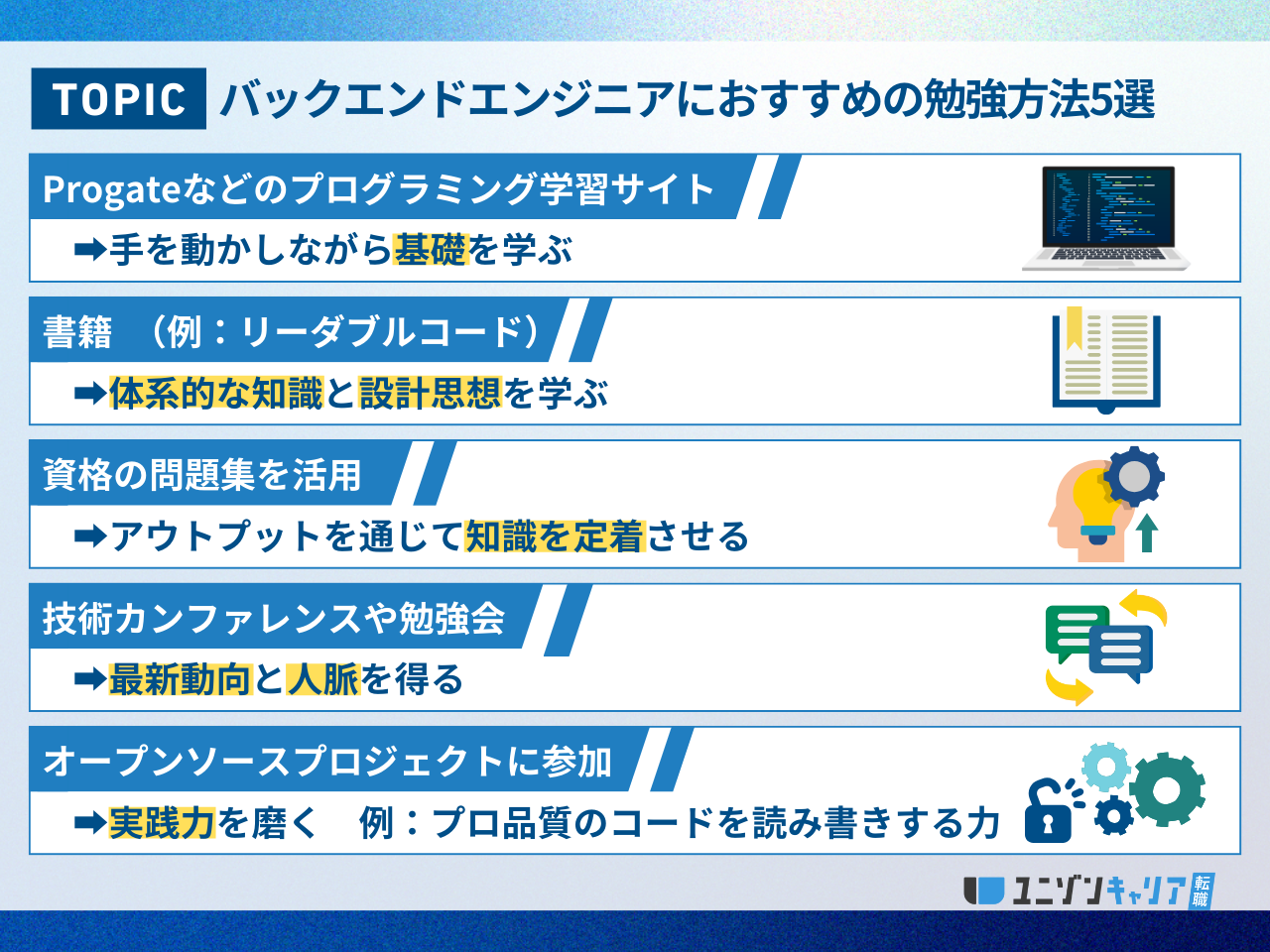 バックエンドエンジニアにおすすめの勉強方法は、基礎から実践へと段階を踏んで進めることが重要です。まずは以下の5つの方法を組み合わせ、効果的にスキルを習得してください。
