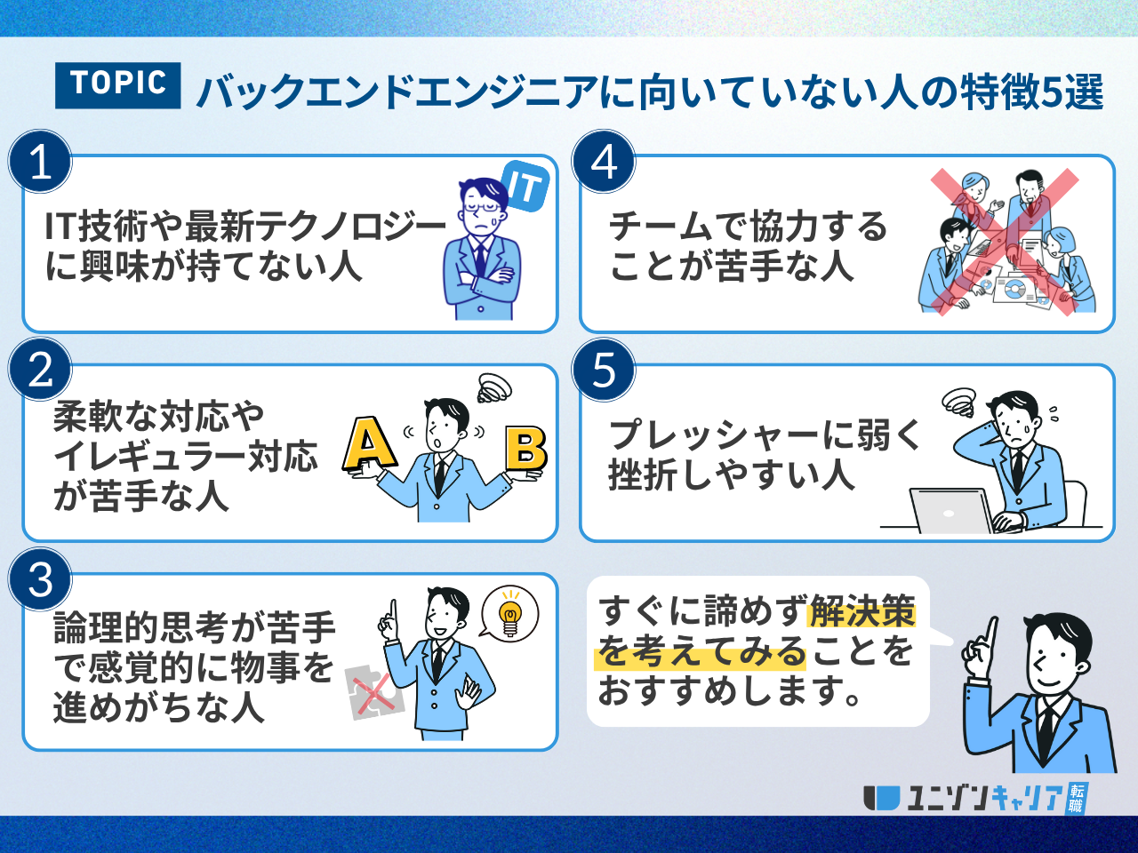 バックエンドエンジニアに向いていない方の特徴には、明確な傾向があります。具体的な特徴は以下の5つです。