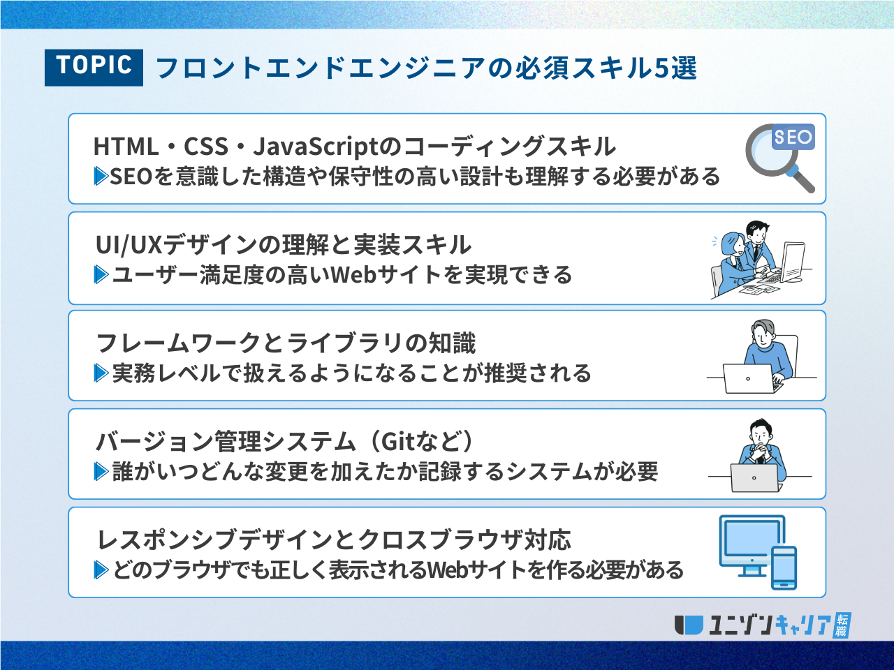 フロントエンドエンジニアに必要なスキルは多岐にわたり、基礎から応用まで段階的に習得する必要があります。ここでは、現場で即戦力として活躍するために欠かせない5つの要素を紹介します。