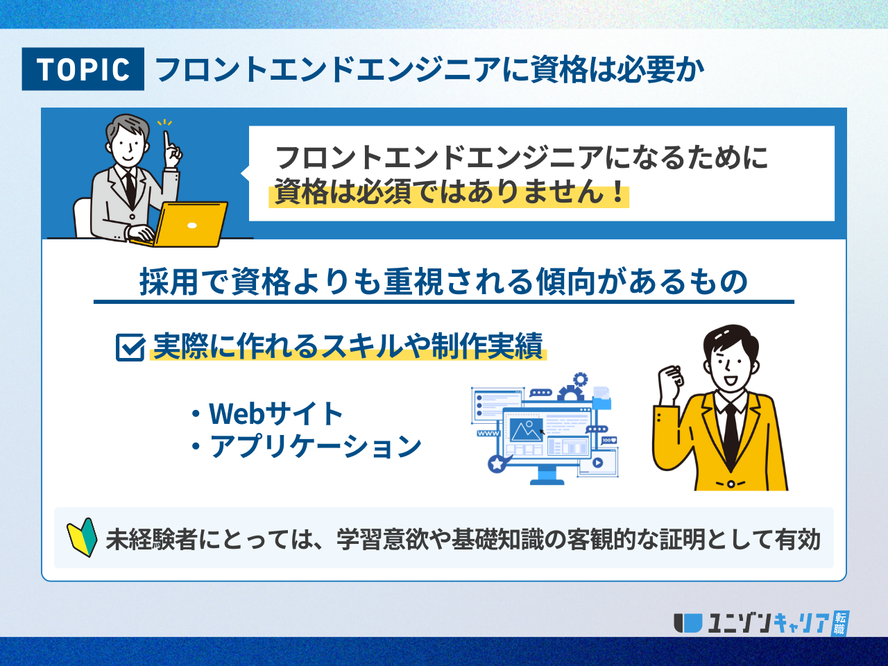 フロントエンドエンジニアへの転職において資格は必須ではありませんが、未経験の方にとっては自身の価値を証明する有効な手段です。