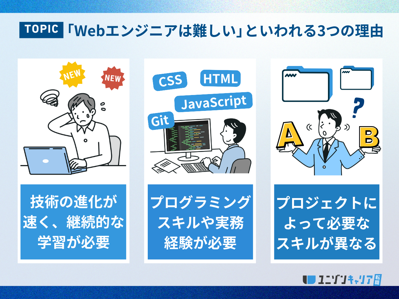 Webエンジニアは専門的なスキルが必要であり、未経験の方から目指すことは簡単ではありません。ここでは、未経験からWebエンジニアを目指すことが難しいといわれる理由を掘り下げて紹介します。