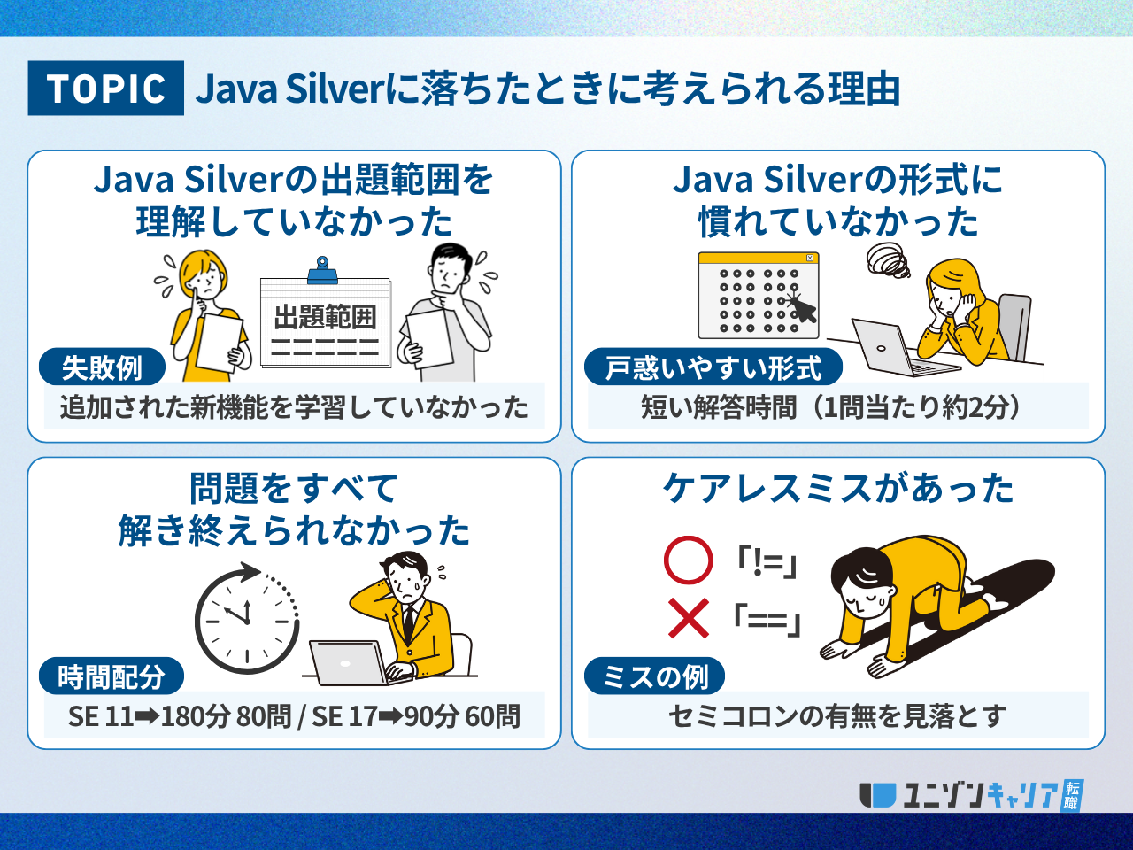 本記事ではJava Silverに落ちた方を対象に、原因を特定する方法や合格するための対策、再受験時のポイントなどを解説します。