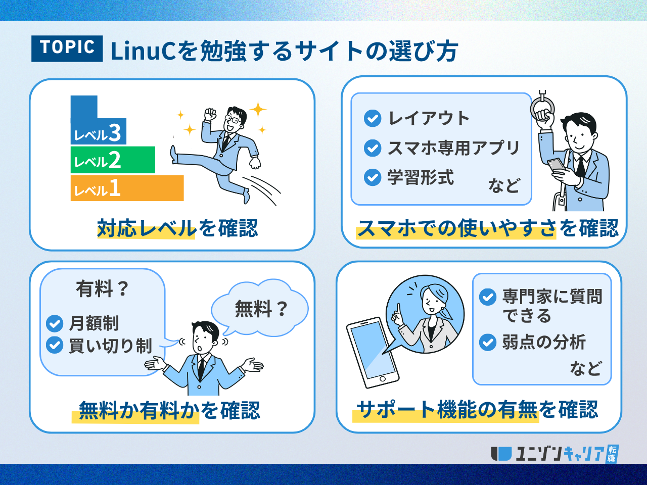 LinuCを効率的に学ぶには自分の目的や環境に合った勉強サイトを選ぶことが重要です。以下のポイントを意識して比較すると、LinuCの学習の質が向上します。