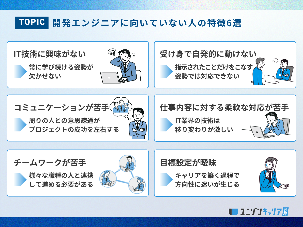 開発エンジニアに向いていない方には、いくつかの共通する特徴があります。ここでは、6つの具体的な特徴をみていきます。