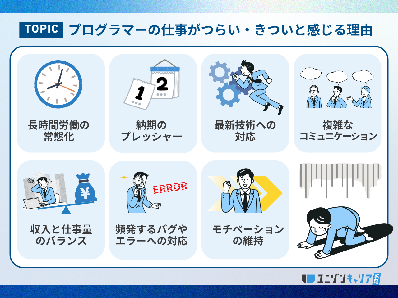 プログラマーの仕事が「つらい」「きつい」といわれる背景には、IT業界特有の働き方や業務の性質が関係しています。ここでは、未経験の方が特に不安に感じる7つの理由を掘り下げて解説します。