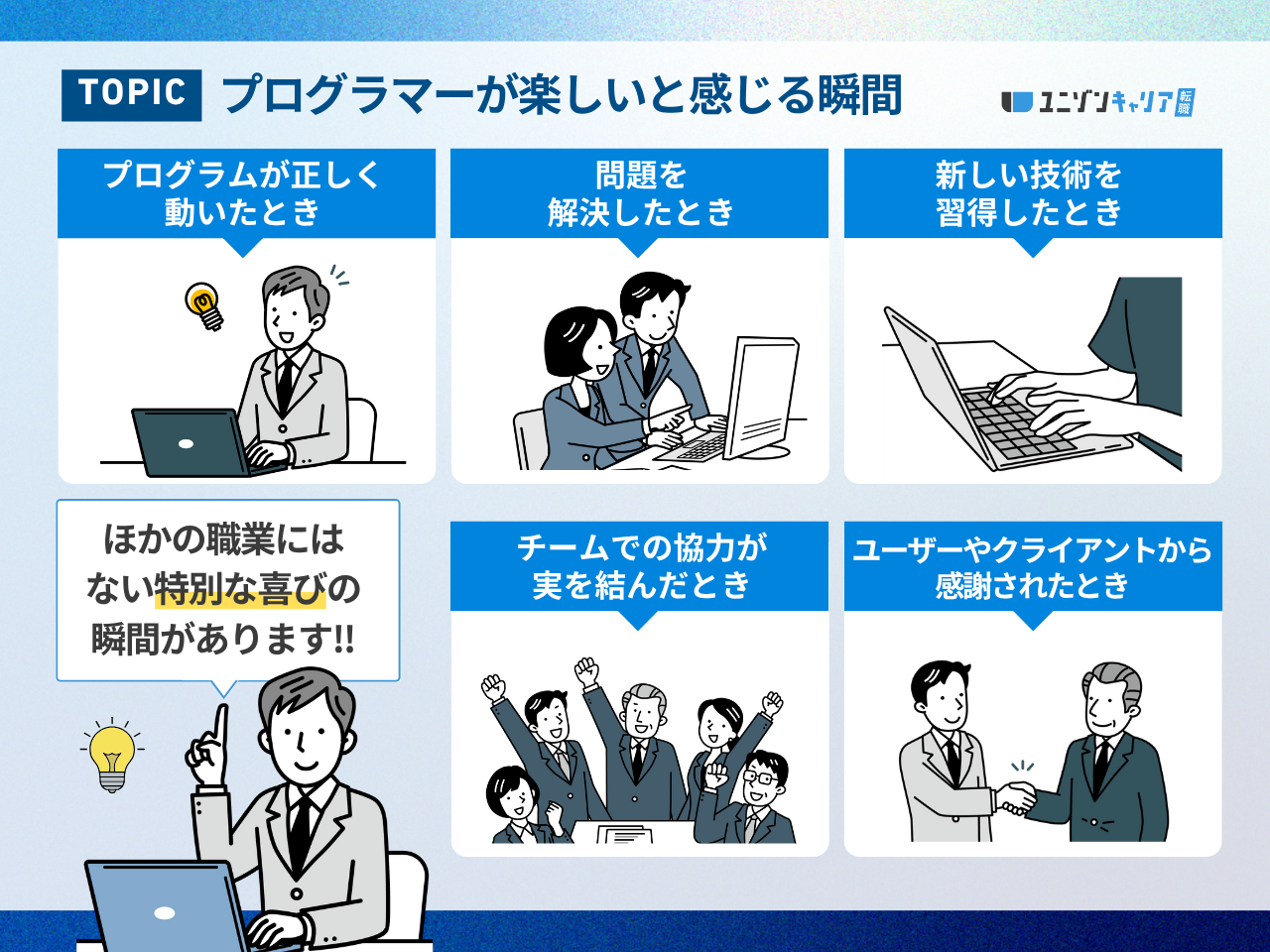 自分の知識やスキルを駆使して目の前の壁を乗り越えたとき、プログラマーは大きな達成感を味わえます。