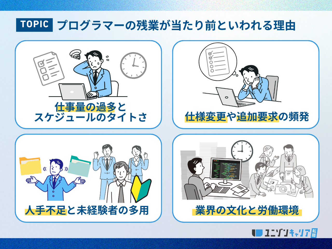 そもそも納期までに完了できないような仕事量やスケジュールが長時間労働を常態化させ、プログラマーの残業を増やす引き金となっているのです。