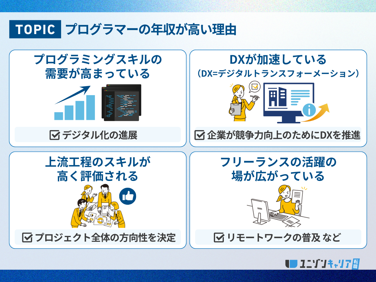 プログラマーの平均年収は日本の平均年収を上回る水準にあり、その背景には需要の増加やDX化などいくつか理由があります。