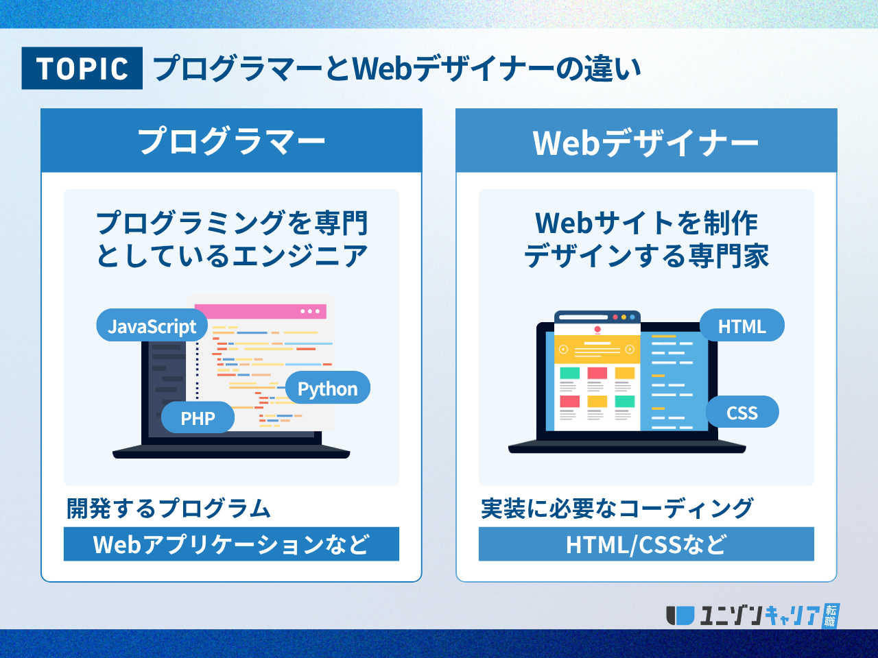 混同されることもありますが、プログラマーは主にシステムをコードで実装する職種、Webデザイナーは主にWebデザインを設計する職種という違いがあります。