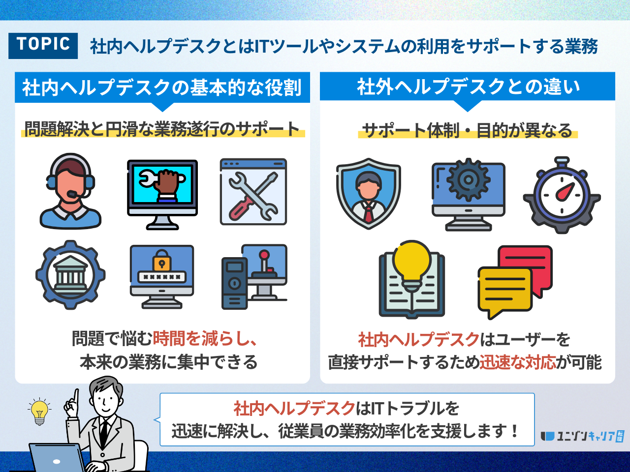 社内ヘルプデスクの基本的な役割は、従業員が直面するIT関連の課題を解決し、円滑な業務遂行をサポートすることです。