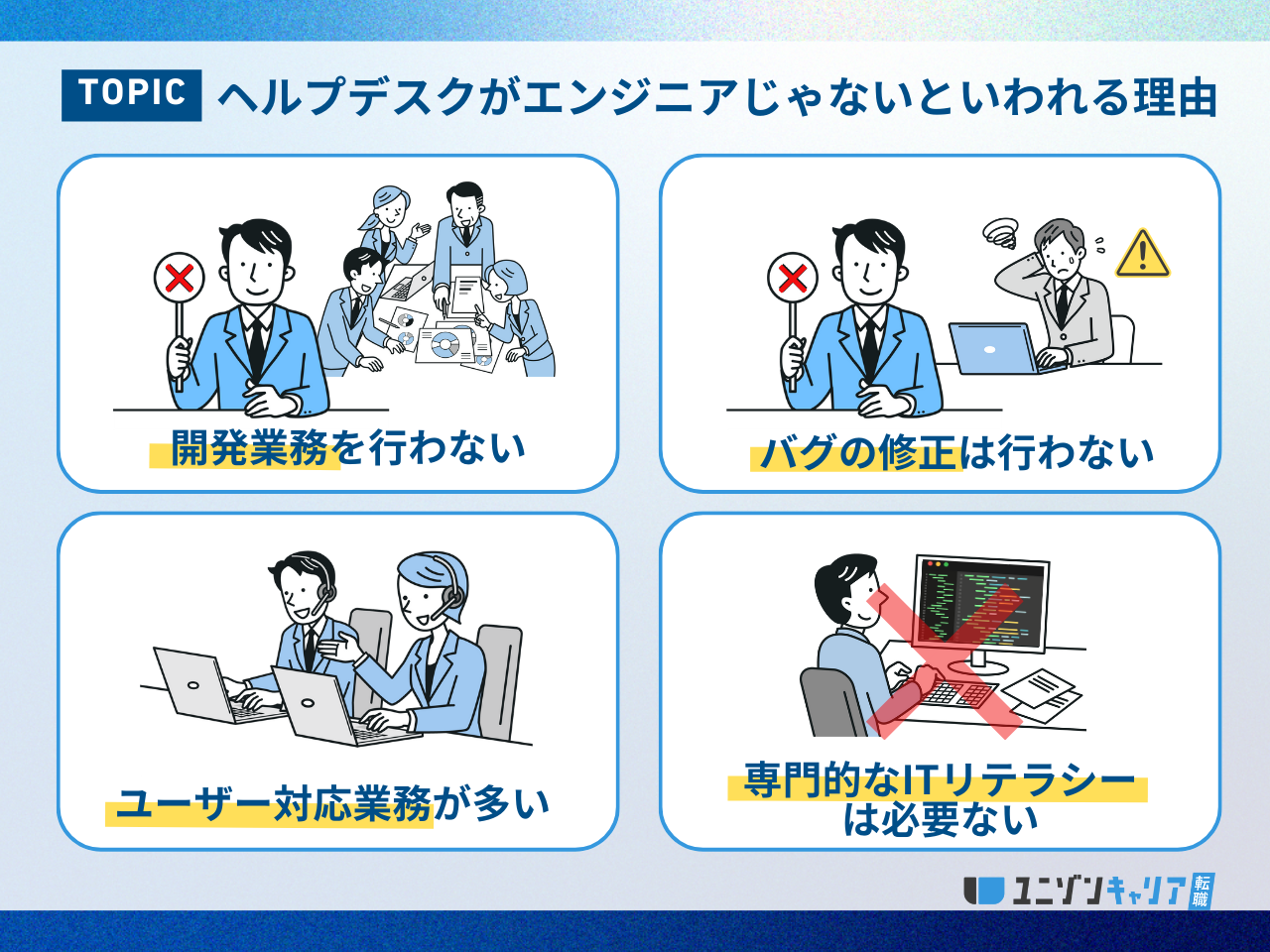 このように、ヘルプデスクはエンジニアと根本的な業務の性質が異なるため、職種として明確に区別されています。