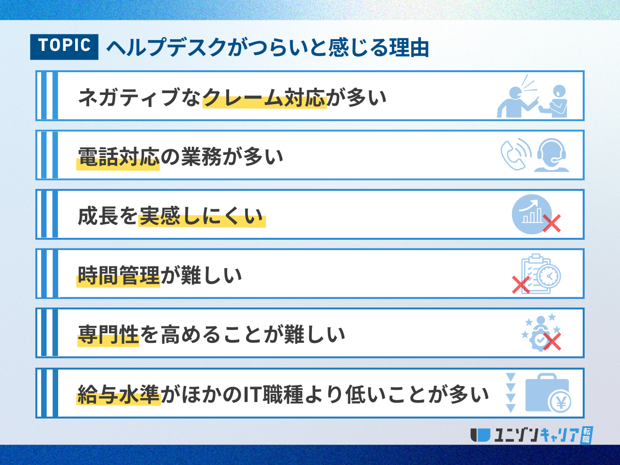 ヘルプデスクがつらいと感じる背景には、業務の性質や待遇に関わる6つの主な理由が存在します。これらの要因が積み重なることで、多くの担当者が精神的な負担を感じています。