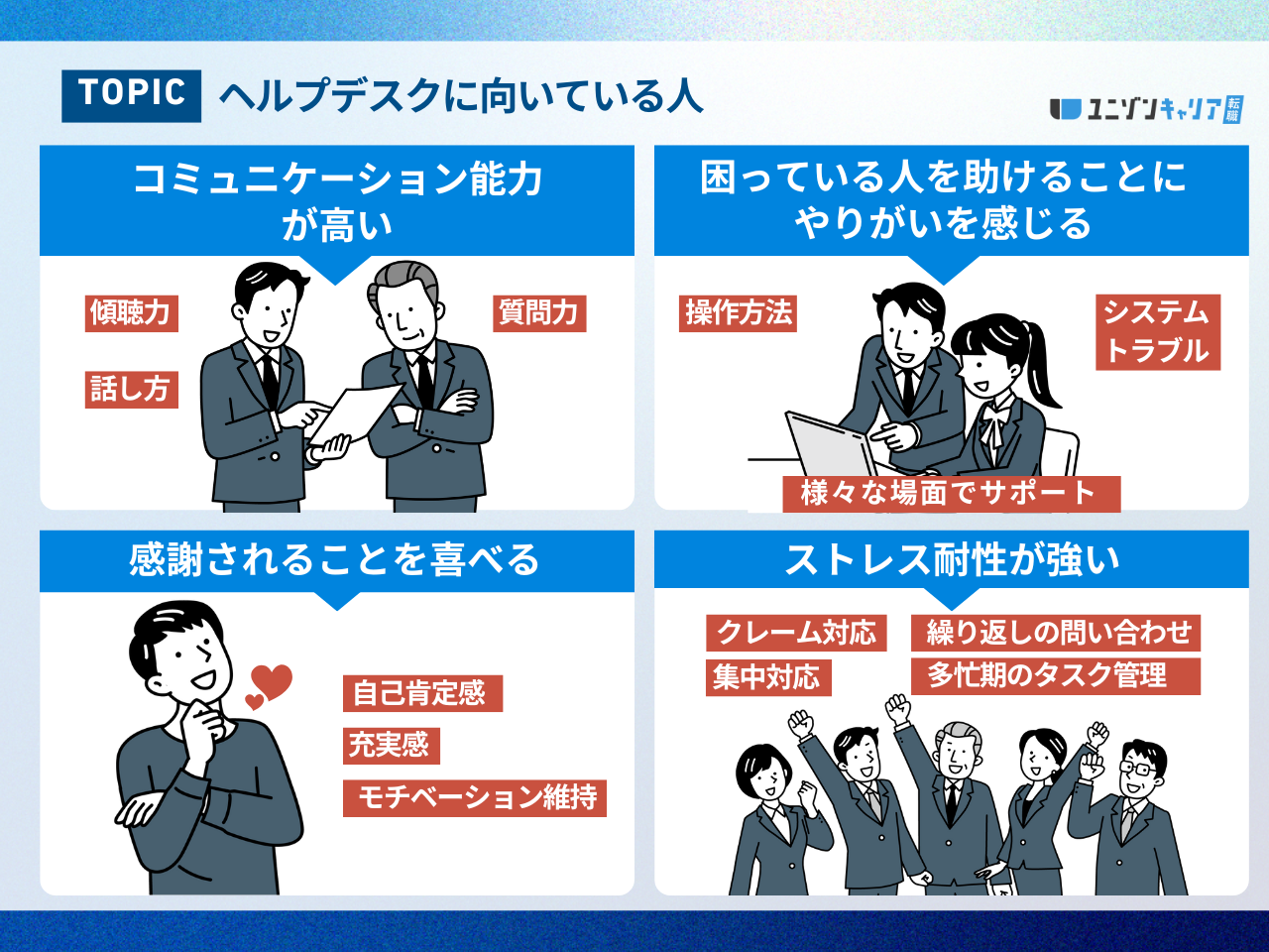 そのため、ITや技術に対して関心が薄く、自ら学ぶ姿勢を持てない方は、ヘルプデスクには不向きであるといえます。