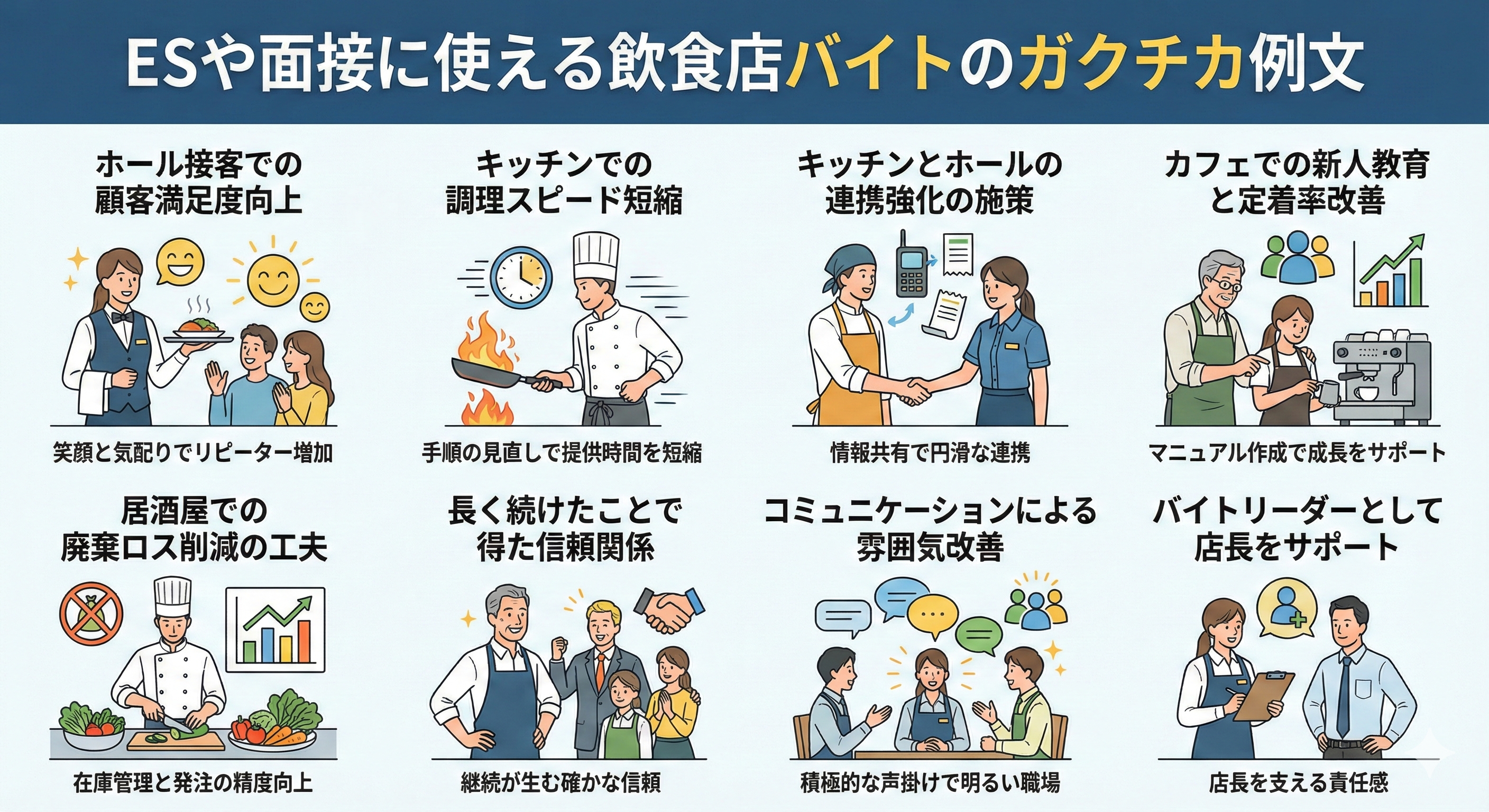 飲食店のアルバイトは、チームワーク、対人スキル、忍耐力、課題解決能力など、仕事に必要な基礎スキルを総合的にアピールできる素晴らしい経験だからだ。