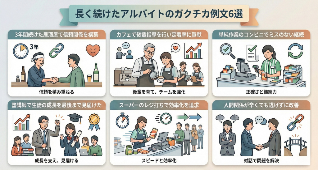 長く続けたバイト経験を使う場合、ガクチカでは辞めたくなるような困難をどう乗り越え、継続したかという物語を語り、プロセスを重視する。