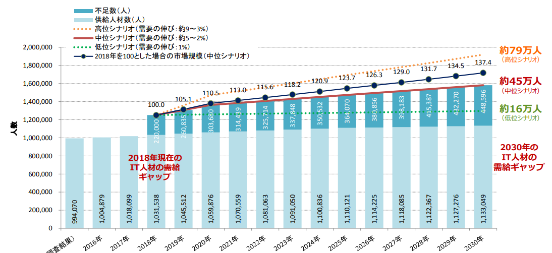 経済産業省の調査では、IT人材は2030年に最大で約79万人不足すると予測されている。