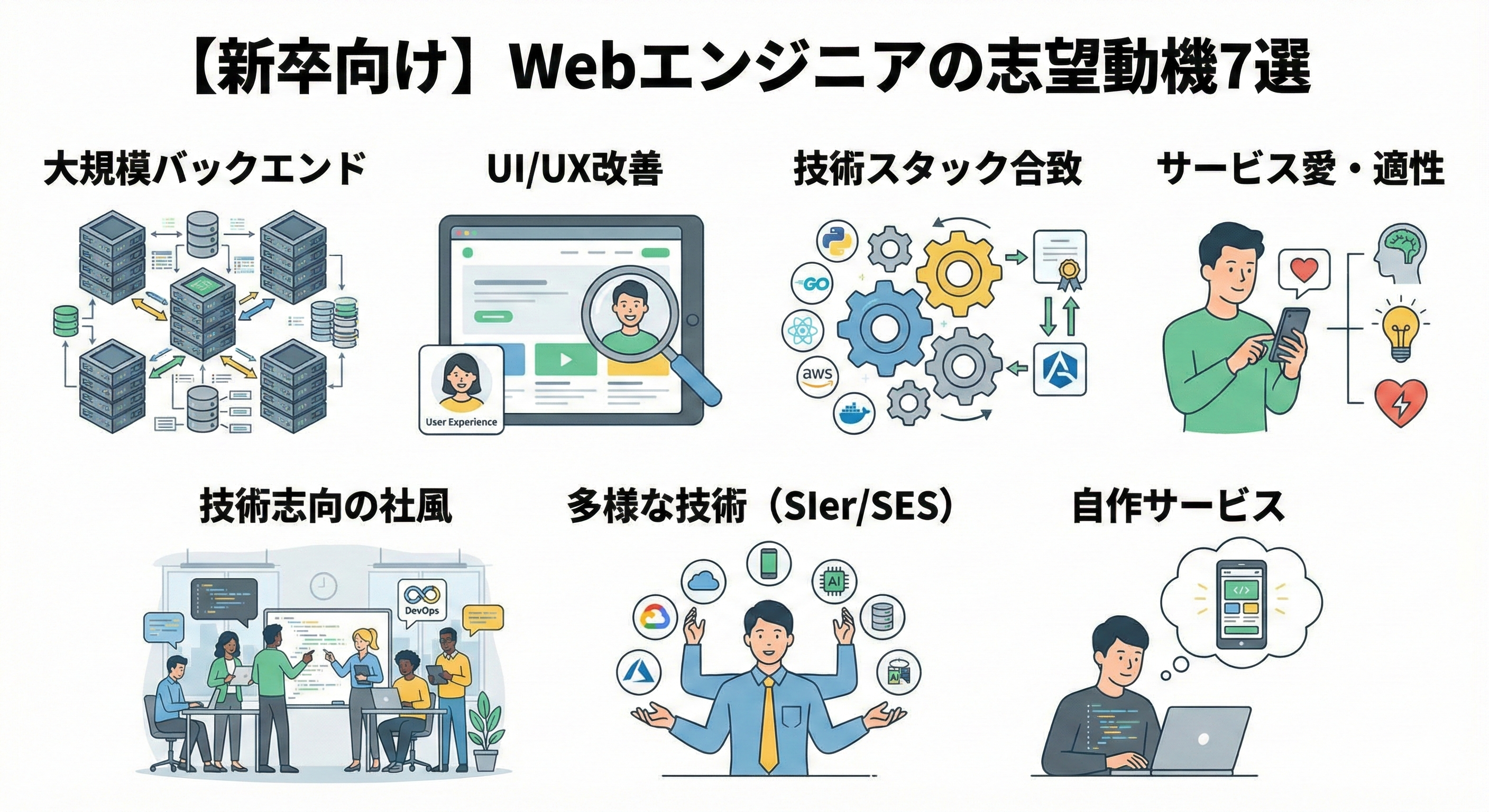 一方、SIerやSESであれば、「様々な業界のシステムに関わりたい」「多様な技術に触れてスキルアップしたい」という技術への探求心や適応力が評価されやすい。